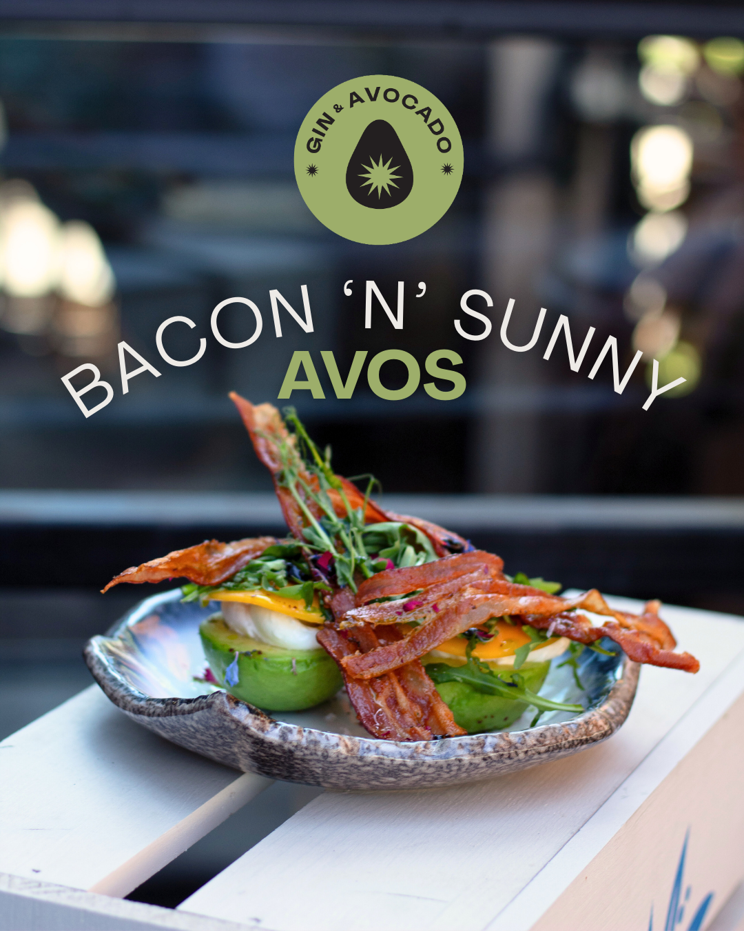 avokádó, posírozott tojás, szalonna, cheddar sajt, rukkola