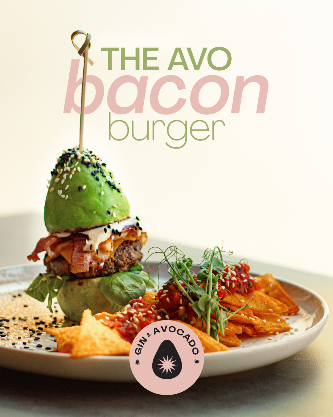 avokádó, marhahúspogácsa, cheddar sajt, szalonna, lilahagyma, paradicsom, madársaláta, fokhagymás parmezánkrém