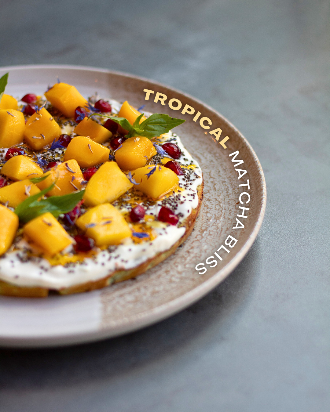 matchás gofri, mascarpone krém, kókuszchips, mangó, chia mag